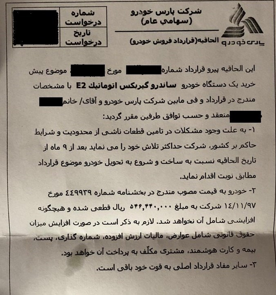 در بند طرح پیشنهادی "الحاقیه قرارداد"پارس خودرو اعلام کرده مشتریان در صورت تمایل به انتظار تا تولید مجدد محصولات رنو و ادامه سود مشارکت و جریمه تأخیر طبق قرارداد (مجموعاً ۲۷ درصد) و محاسبه قیمت قدیم می‌توانند نسبت به امضاء الحاقیه قرارداد اقدام کنند.