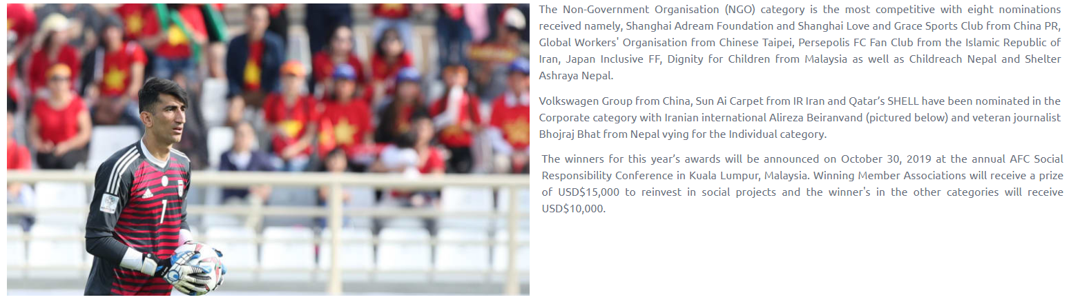 در بخش انفرادی که پرسپولیسیها صاحب نماینده هستند، نیز علیرضا بیرانوند سنگربان این تیم با بوجراج بوهات اهل کشور نپال برای کسب این عنوان رقابت خواهد کرد.