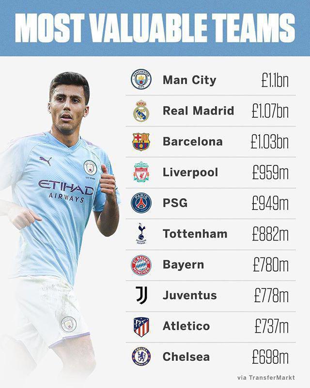 در این لیست باشگاه فوتبال منچستر سیتی انگلیس در صدر و رئال مادرید و بارسلونا اسپانیا در رده های دوم و سوم قرار دارند.