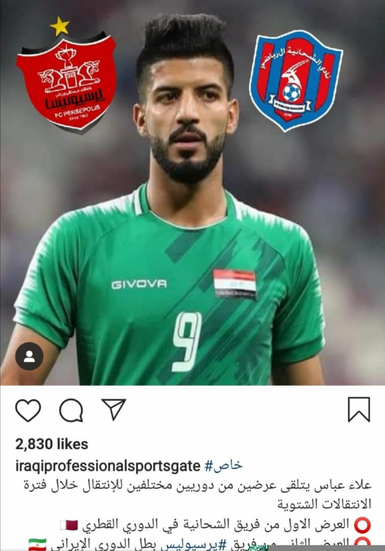 پرسپولیس برای تقویت خط حمله اش برای نیم فصل دوم به دنبال جذب علا عباس، مهاجم تیم ملی عراق و عضو باشگاه الزورا بود.