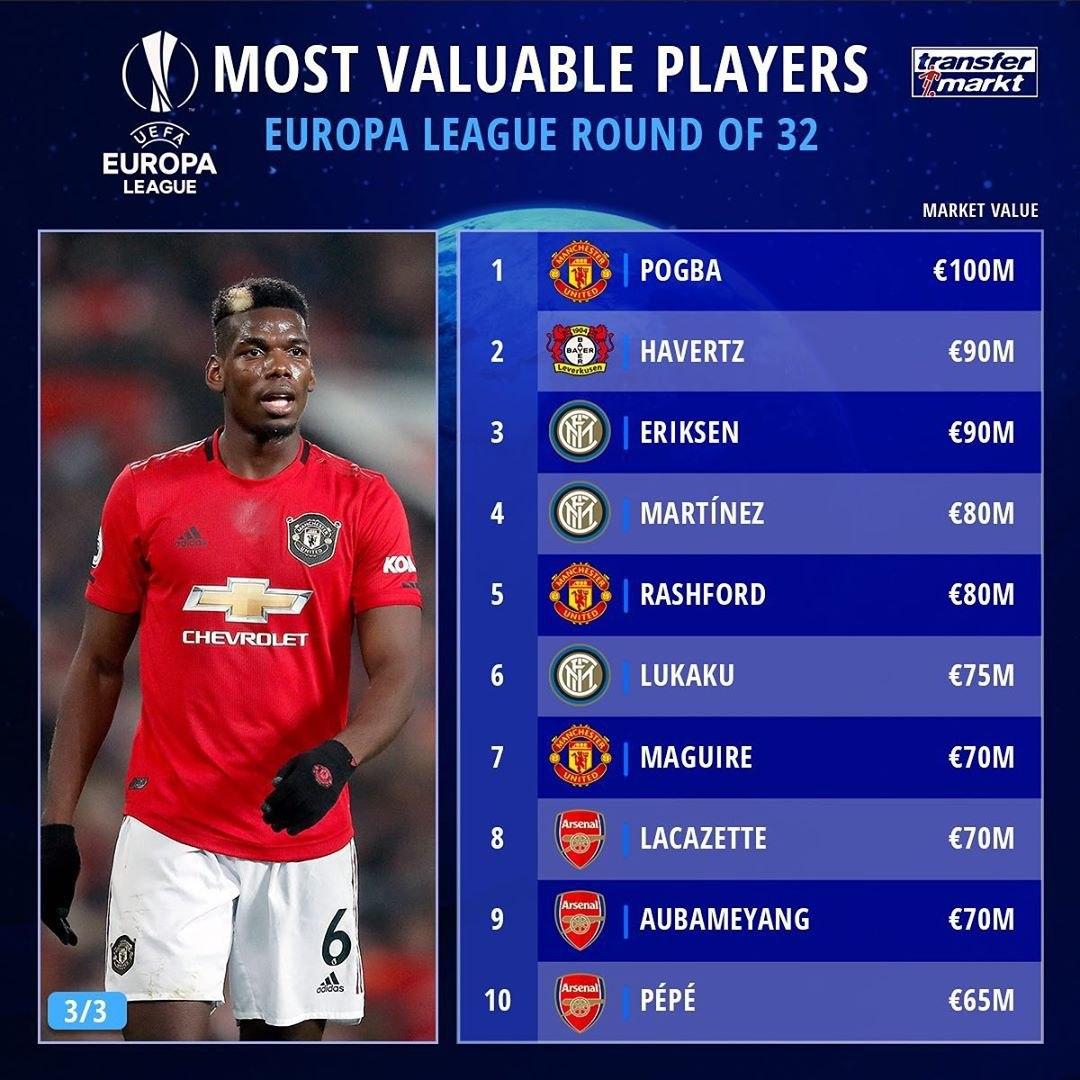 در صدر این رنکینگ، پُل پوگبا فرانسوی، بازیکن تیم فوتبال منچستر یونایتد با ارزشی معادل ۱۰۰ میلیون یورو قرار دارد و کای هاورتز، پدیده جدید فوتبال آلمان و تیم بایرلورکوزن، به همراه کریستین اریکسن، هافبک اینتر میلان با ارزش ۹۰ میلیون یورویی نفرات دوم و سوم این لیست هستند.