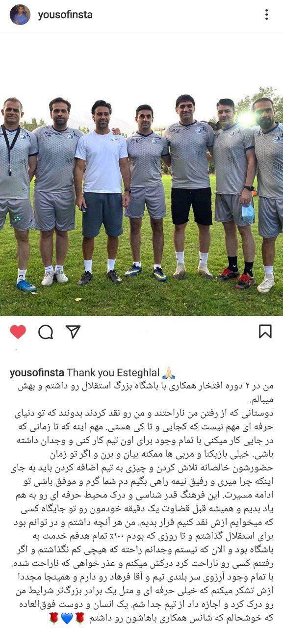 یوسف دانشیار مربی تیم فوتبال استقلال با انتشار پیامی از این تیم خداحافظی کرد.