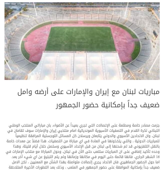 سایت «elmaestrosport» لبنان خبر داد پرونده انتقال بازی های خانگی تیم ملی لبنان با ایران و امارات منتفی است چون فیفا و AFC تمام دستورات بهداشتی و لوجستیکی را برای برگزاری این دو بازی در انتخابی جام جهانی به فدراسیون لبنان ارسال کرده اند اما در زمینه برگزاری این دو بازی با حضور تماشاگران به نظر می رسد هر دو بازی بدون تماشاگر برگزار خواهد شد و احتمال برگزاری بازی با حضور هواداران بسیار ضعیف است.