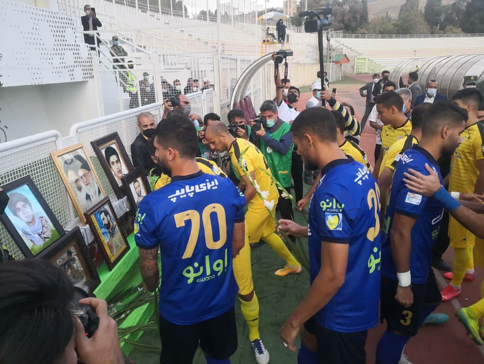 * بازیکنان دو تیم قبل از بازی با قرار دادن شاخه گل در مقابل جایگاه ویژه ای که برای تکریم شهدا در نظر گرفته شده بود، به آنها ادای احترام کردند.