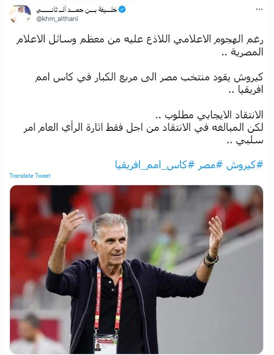 عضو افتخاری باشگاه العربی قطر در این زمینه، گفت: با وجود حملات تند رسانه ای از سوی اکثر رسانه های مصر ولی کی‌روش فراعنه را به نیمه نهایی جام ملت های آفریقا رساند.