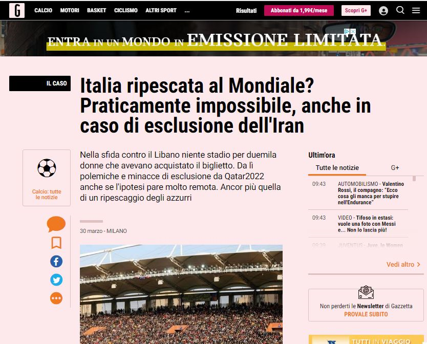 اما نشریه معتبر «گازتا دلو اسپورت» ایتالیا امروز در گزارشی به این شایعات پایان داد و نوشت: در بازی ایران با لبنان دو هزار زن که بلیت خریده بودند راهی برای ورود به ورزشگاه پیدا نکردند. از آنجا شایعات در زمینه احتمال حذف ایران از جام جهانی 2022 کلید خورد. این فرضیه بسیار دور از دسترس است و اگر به فرض محال رخ داد، آتزوری جانشین ایران نمی شود.