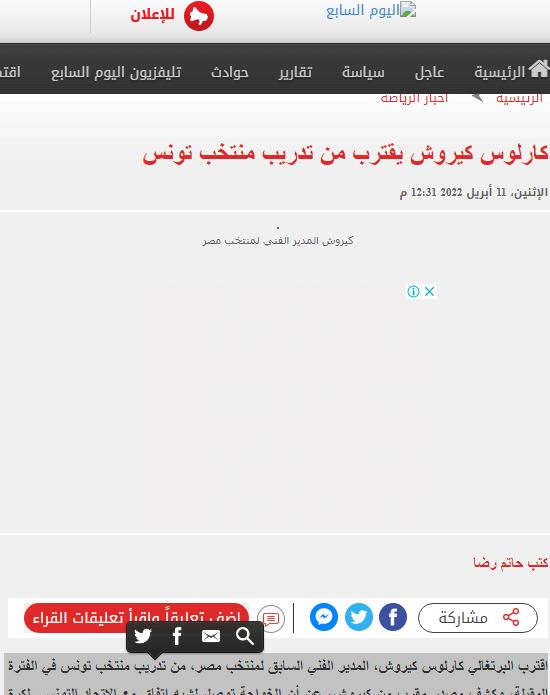 براین اساس نشریه «الیوم السابع» مصر امروز با انتشار خبری از دوری کارلوس کی روش از ایران خبر داد. طبق اعلام رسانه معتبر مصری مربی پرتغالی با فدراسیون فوتبال تونس به توافق اولیه رسیده تا هدایت تیم ملی این کشور را برعهده بگیرد.