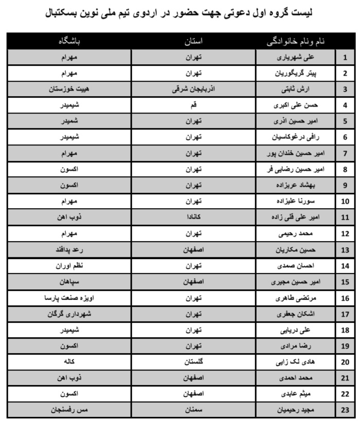 محمدرضا اسلامی اسامی گروه اول نفرات دعوت شده به اردوی تیم ملی بسکتبال ایران نوین را اعلام کرد.