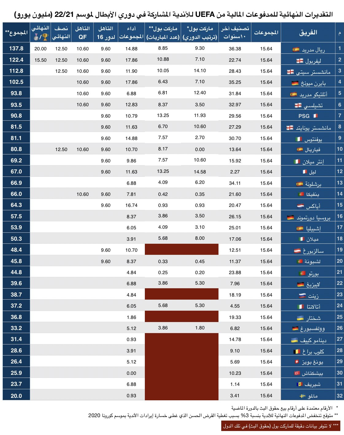 طبق گزارش این رسانه رئال مادرید قهرمان اروپا از حضور در این فصل لیگ قهرمانان مجموعا 138 میلیون یورو درآمد داشته است. لیورپول نایب قهرمان اروپا با 122 میلیون یورو در رده دوم پردرآمدترین باشگاه ها قرار گرفت.