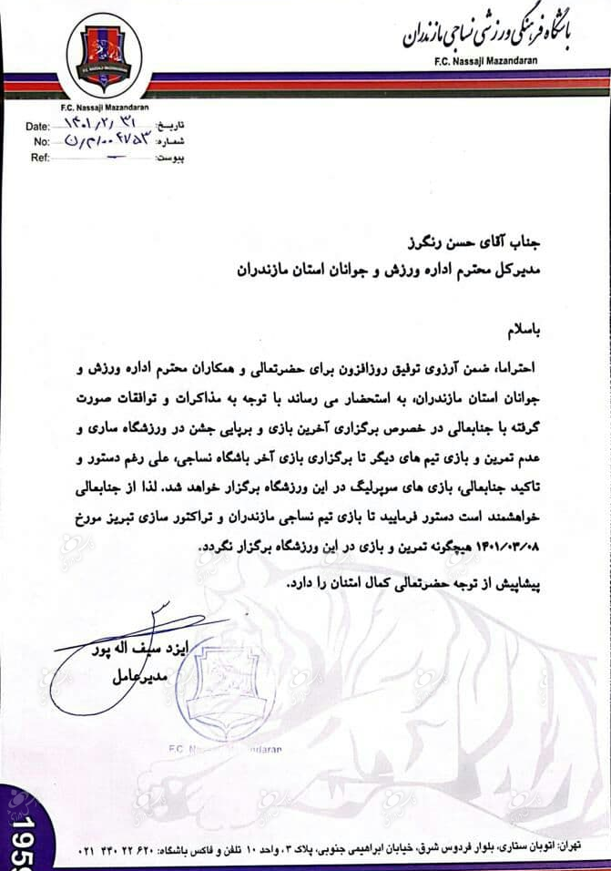 ایزد سیفالله پور مدیر عامل باشگاه نساجی روز گذشته در این خصوص اعلام کرد: "قرارداد این بازی با ورزشگاه پاس قوامین بسته و هماهنگی لازم هم با نیروی انتظامی از طریق همین ورزشگاه انجام شد. مگر دو هفته قبل با تیم هوادار در همین ورزشگاه پاس قوامین بازی نکردیم؟ اشکالش کجا بود که بازی امروز برگزار نشد. اینکه فوتبال نیست. یک دورهمی است که هر وقت هوس کردند فوتبال برگزار کنند، هر وقت هم هوس کردند بازی نکنند، درش را تخته کنند. همین یک شب بیش از 200 میلیون تومان برای ما هزینه داشت. میزبان، داور، ورزشگاه و هتل را جداگانه حساب کردیم. چرا اصلاً این بازی به تأخیر افتاد؟ این مسابقه قرار بود 8 خرداد برگزار شود. الان دوستان ورزشگاه را برای مسابقه شهرخودرو و فولاد (در روز پنجشنبه) آماده میکنند. چرا مسابقه فجر و پرسپولیس در تهران برگزار میشود؟ اسم ا ین فوتبال را عوض کنید و بگویید فوتبال دورهمی که توسط رئیس فدراسیون، دبیرکل فدراسیون، رئیس سازمان لیگ اداره نمیشود. دو سه نفر نشستهاند اگر تصمیم بگیرند فوتبال برگزار میشود و اگر نه برگزار نمیشود. روزی که اعلام کردید بازیها برگزار نمیشود آلایندگی هوا 157 بود، ما در آلایندگی 270 با پرسپولیس بازی کردیم."