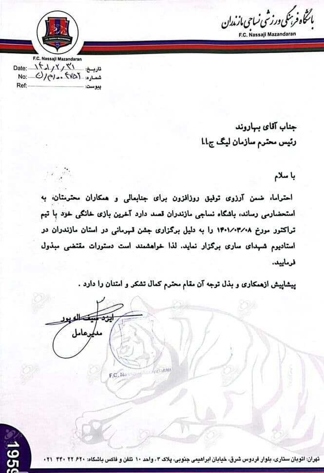 روز گذشته دیدار دو تیم نساجی مازندران و تراکتور تبریز در هفته پایانی لیگ برتر لغو و پروندهای جهت بررسی به دلیل اعلام نشدن محل میزبانی از سوی باشگاه نساجی به کمیته انضباطی فدراسیون فوتبال ارسال شد.