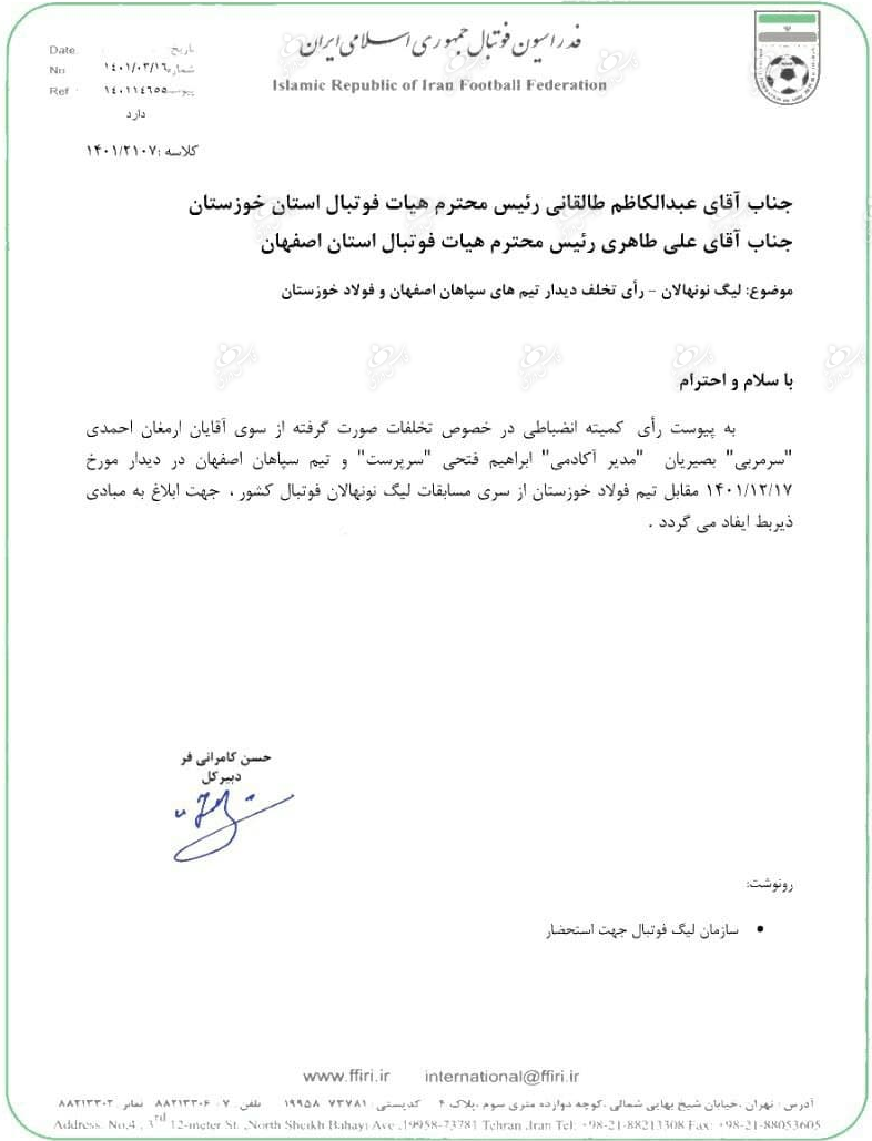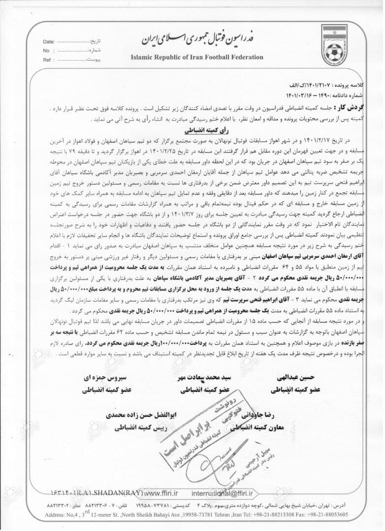 سپاهان با رای انضباطی بازنده شد/ عنوان قهرمانی به فولاد خوزستان رسید +تصویر حکم
