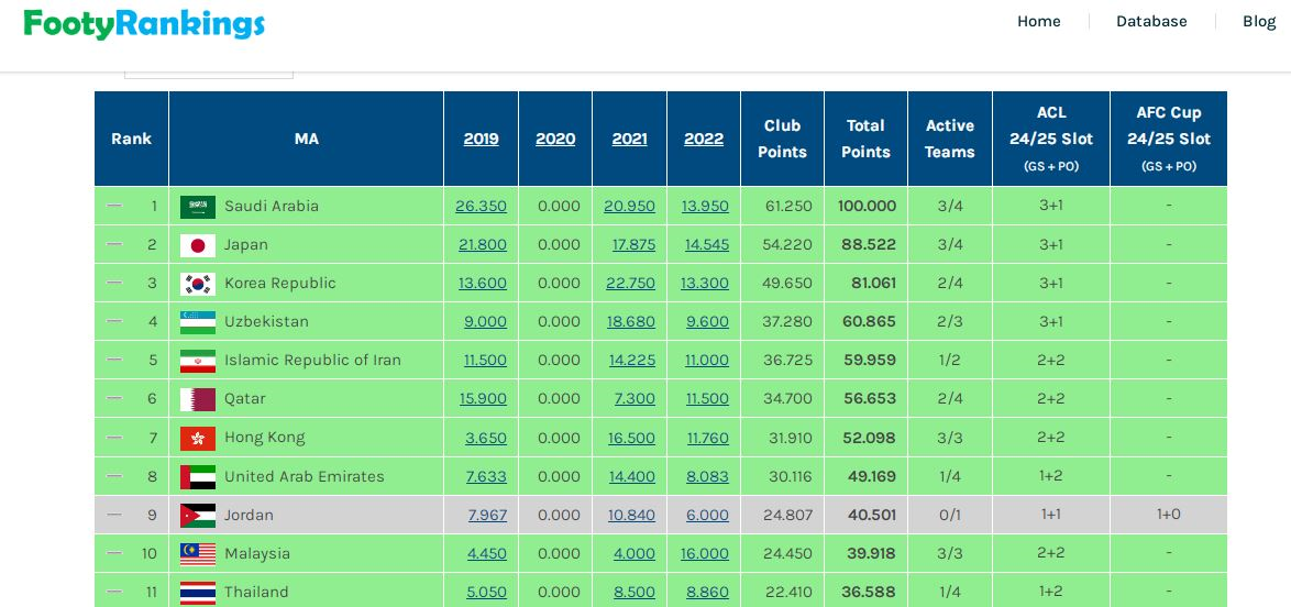 رتبه بندی نهایی در پایان فصل 2022 برای تخصیص جایگاه برای مسابقات باشگاهی AFC در سال 2024 استفاده خواهد شد. امتیازات برای فصل 2021 و 2022 بر اساس روش محاسبه تجدید نظر شده لحاظ می شود.