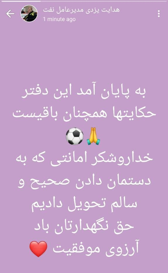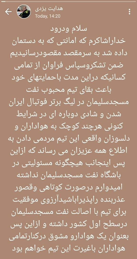مدیرعامل نفت مسجد سلیمان امروز نیز با انتشار پیامی، خداحافظی خودش را اعلام کرد. این در حالیست که یزدی طی سال‌های گذشته رفت و برگشت‌های متعددی به این باشگاه داشته و باید دید با شروع تمرینات تیم و آغاز دوباره فعالیت باشگاه چه تصمیمی از سوی مدیران ارشد نفتی گرفته می‌‌شود و چه اتفاقی خواهد افتاد.