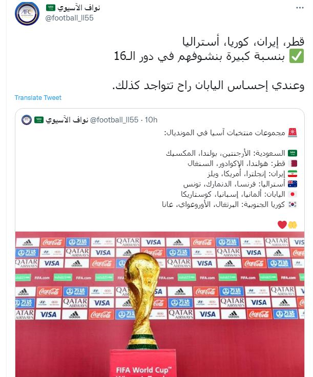 در همین رابطه نواف الآسیوی خبرنگار سعودی در این زمینه با انتشار توئیتی شانس 6 تیم آسیایی راه یافته به جام جهانی برای صعود به مرحله یک هشتم نهایی را پیش بینی کرد.