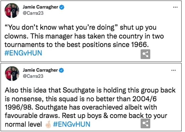 اما جیمی کرگر اسطوره باشگاه لیورپول و مدافع سابق تیم ملی انگلیس به شدت از ساوت گیت حمایت کرد و در توئیتی جنجالی معترضان را به دلقک تشبیه کرد و نوشت: شما نمی دانید دارید چه کار می کنید." ساکت شوید دلقک ها! این مربی کشور را در دو تورنمنت به بهترین موقعیت از سال 1966 رسانده است.