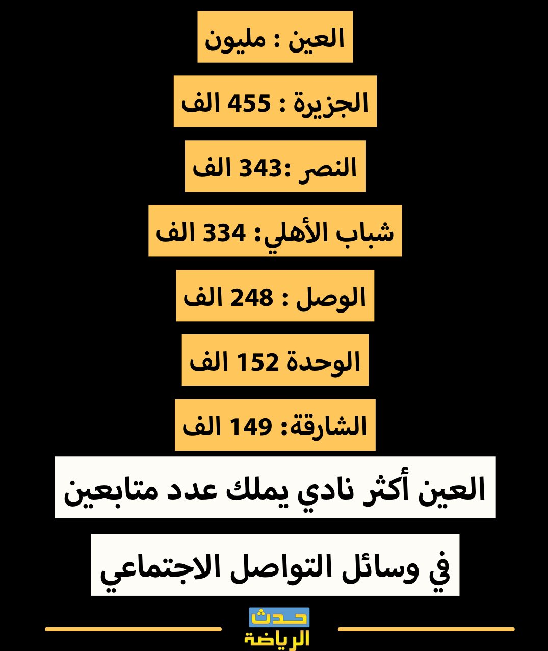 تیم های الجزیره، النصر، شباب الاهلی و الوصل به ترتیب به با داشتن 455 هزار، 343 هزار، 334 هزار و 248 هزار دنبال کننده در رده های دوم تا پنجم ایستادند.