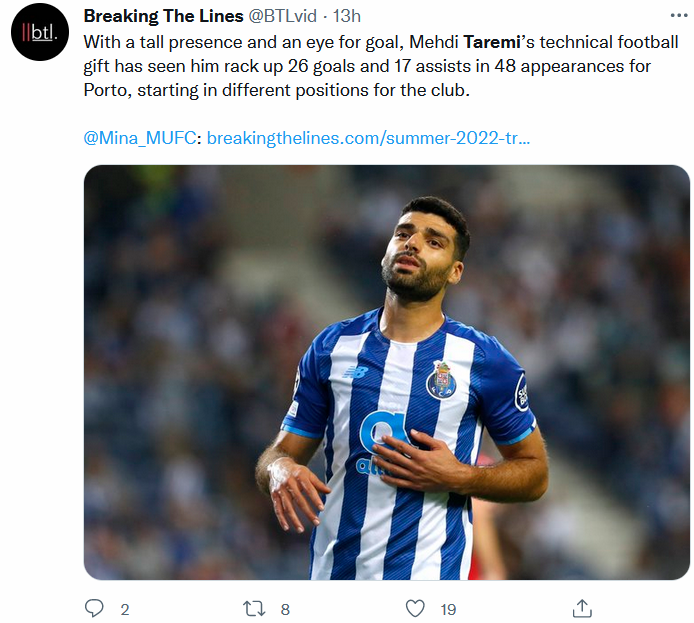 سایت انگلیسی زبان breakingthelines به منچستریونایتد 8 بازیکن را پیشنهاد داد که در تابستان جاری خریداری کند. یکی از آن بازیکنان مهدی طارمی، ستاره کشورمان است.