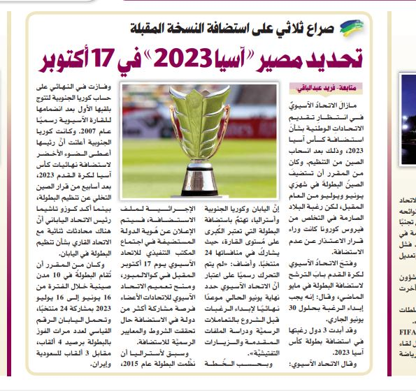 نشریه «الرایه» قطر در گزارشی، نوشت: کنفدراسیون فوتبال آسیا برای انتخاب میزبان جدید مسابقات جام ملت های آسیا 2023 بعد از کناره گیری چین وارد عمل شده است. طبق گزارش های رسیده تاکنون 3 فدراسیون به صورت رسمی برای میزبانی از این رقابت ها عمل کردند.