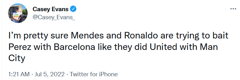 کیسی ایونز، خبرنگار منچسترایونینگ نوشت: من اعتقاد دارم که مندز و رونالدو سعی دارند که پرز را با نام بارسلونا و کاری که سال قبل با یونایتد کردند، گول بزنند.