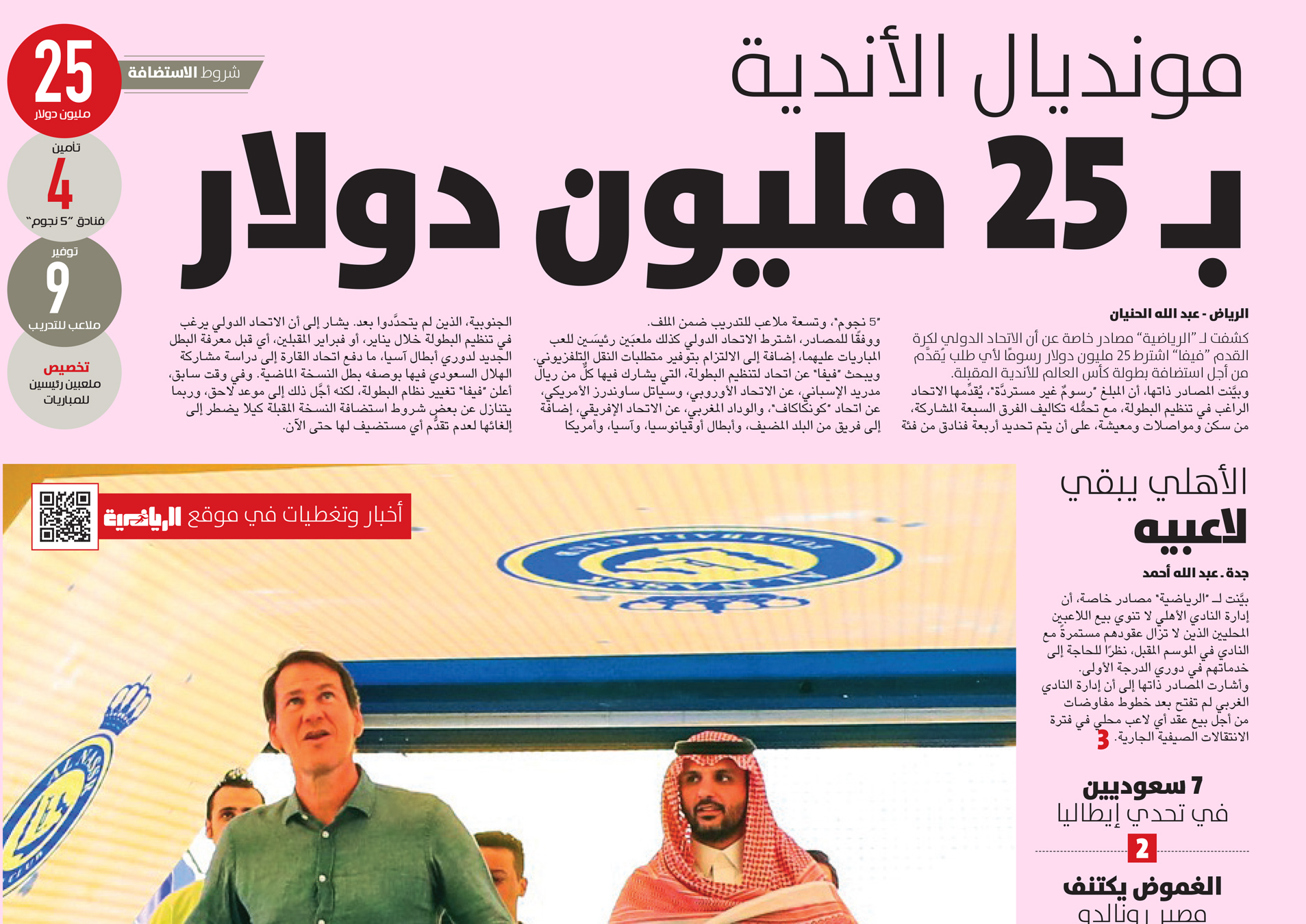 نشریه «الریاضیه» امروز از مبلغ درخواستی فیفا برای کسب میزبانی جام باشگاه های جهان خبر داد. طبق گزارش نشریه سعودی فیفا رقمی بسیار بالا برای میزبان این مسابقات در نظر گرفته است.