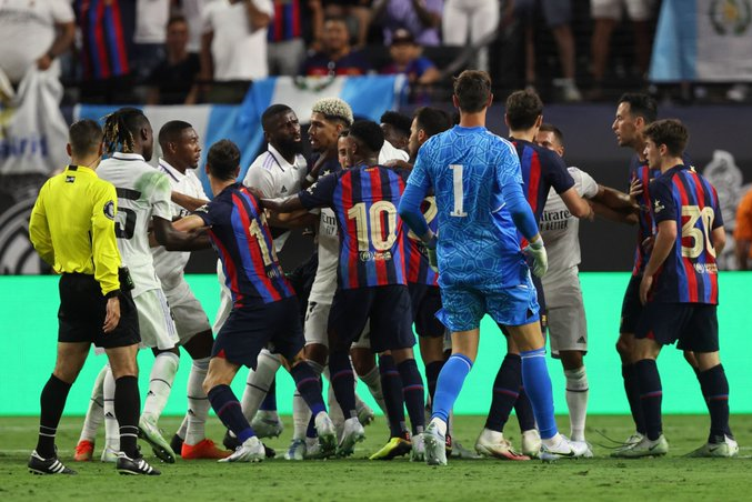 مارکا به لحظات درگیری بازیکنان بارسا و رئال پرداخت و از تنش زیادی در این مسابقه به ظاهر دوستانه حرف زد.