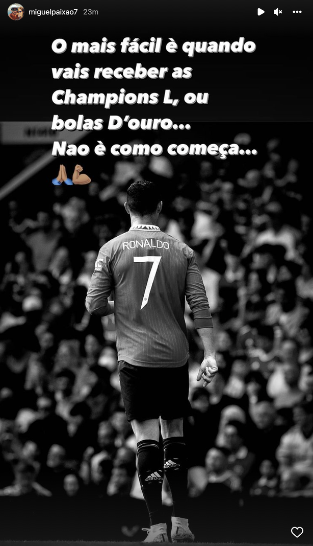 پس از بازی فاجعه آمیز منچستر یونایتد «Miguel Paixao» دوست صمیمی رونالدو در استوری اینستاگرام خود پیام حمایتی از دوستش را منتشر کرد. او به دستاوردهای رونالدو در لیگ قهرمانان اروپا و پنج توپ طلا اشاره کرد و استنباط کرد که مسیر موفقیت همیشه مثبت شروع نمی شود.