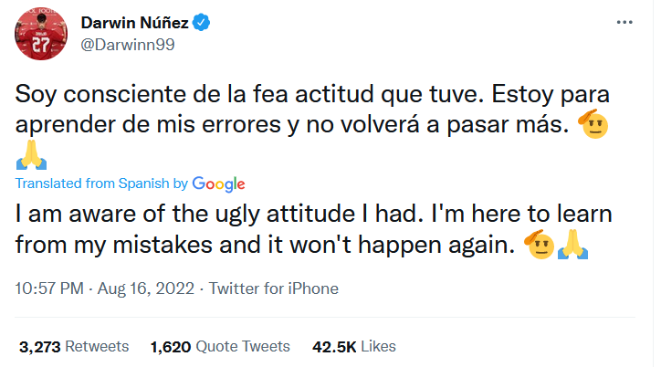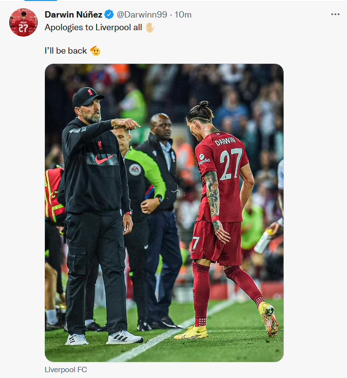 داروین نونیز پس از اخراج در بازی لیورپول مقابل کریستال پالاس در فضای مجازی عذرخواهی کرد.