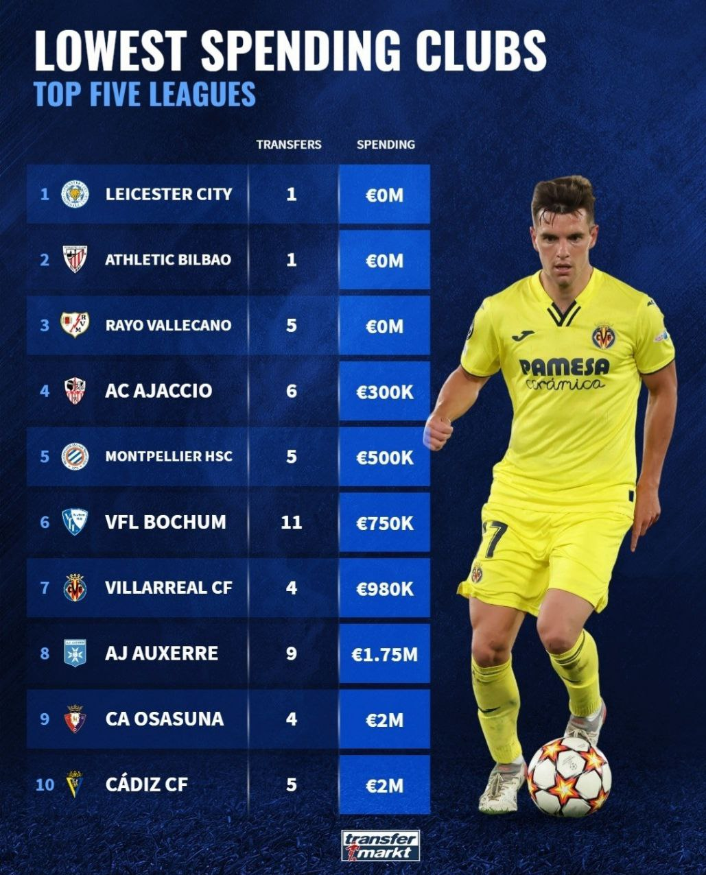 در تصویر زیر کم خرج ترین باشگاهها در 5 لیگ معتبر اروپا را مشاهده کنید: