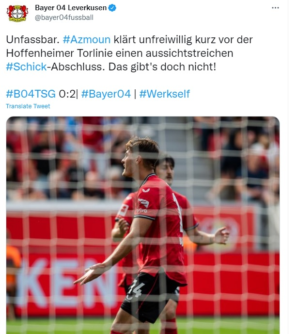 در همین رابطه توئیتر باشگاه بایرلورکوزن به اشتباه بزرگ آزمون که مانع گلزنی تیمش شد این طور واکنش نشان داد: غیر قابل درک! آزمون ناخواسته شوت امیدوارکننده شیک را کمی قبل از خط دروازه هوفنهایم بیرون آورد. غیرممکن است!