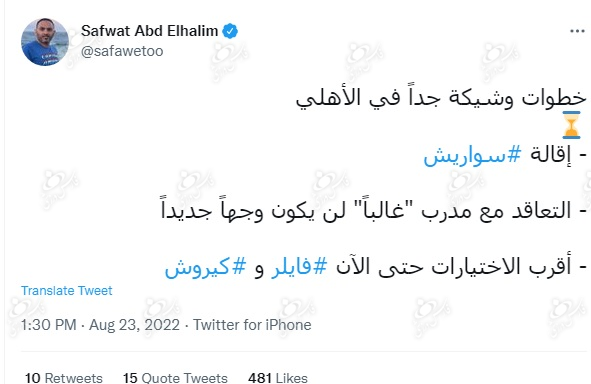 در این زمینه صفوات عبدالحلیم خبرنگار مصری شبکه «الکاس» قطر خبر داد باشگاه الاهلی در آستانه برکناری سوارش از سمت مربیگری است. نزدیکترین گزینه برای هدایت الاهلی رینه وایلر سوئیسی و کارلوس کی روش پرتغالی هستند.