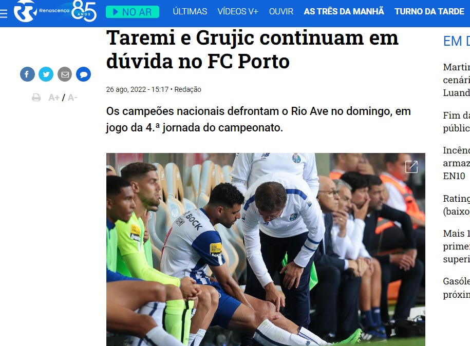 در همین رابطه نشریه «sapo» پرتغال درباره آخرین وضعیت مصدومیت طارمی خبر داد پورتو فردا( یکشنبه) در دیداری از هفته چهارم رقابت های لیگ پرتغال به مصاف ریو آوه می رود.