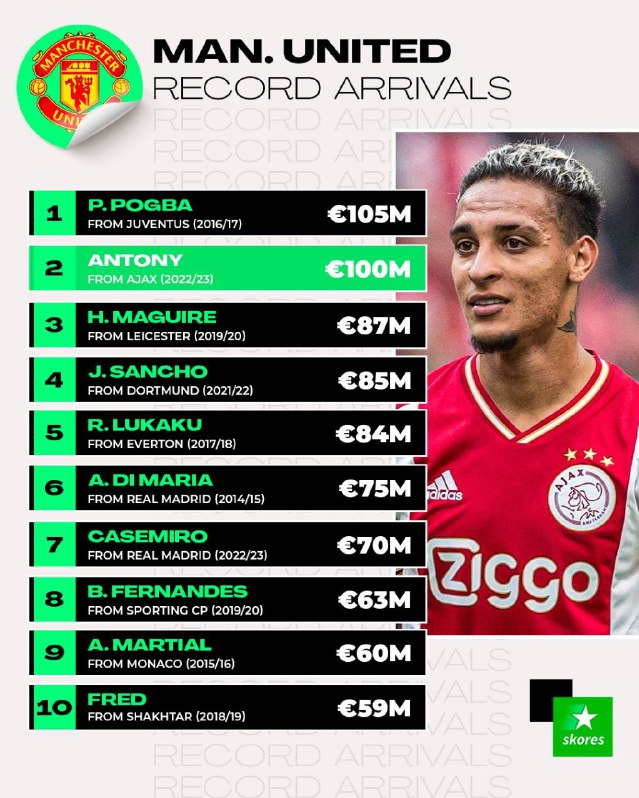 به بهانه انتقال آنتونی از آژاکس به منچستریونایتد با مبلع نجومی 100 میلیون یورو، فهرستی از گرانترین خریدهای این باشگاه منتشر شد.