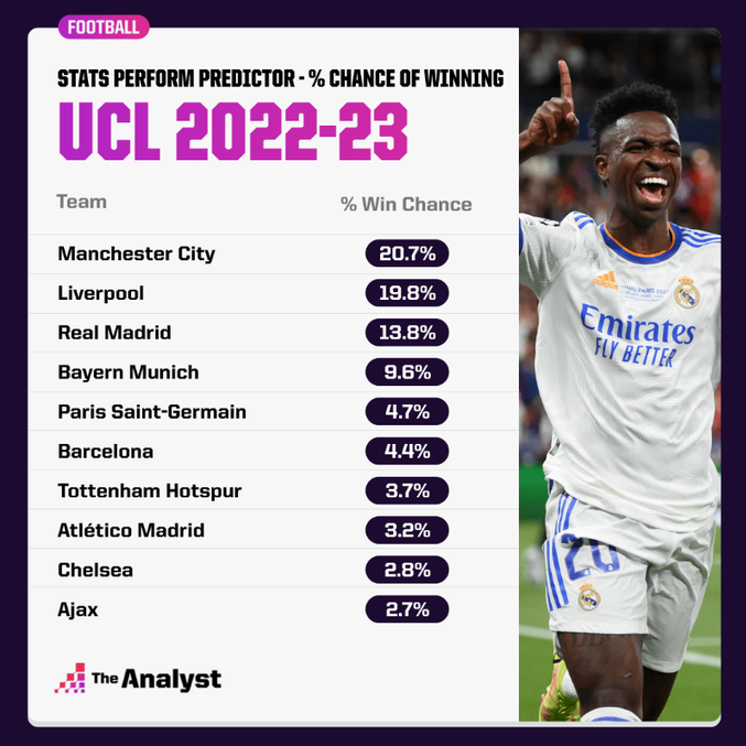 سایت «theanalyst» آماری در یک ارزیابی شانس اول تا دهم قهرمانی در لیگ قهرمانان اروپا 2022-2023 را معرفی کرد.