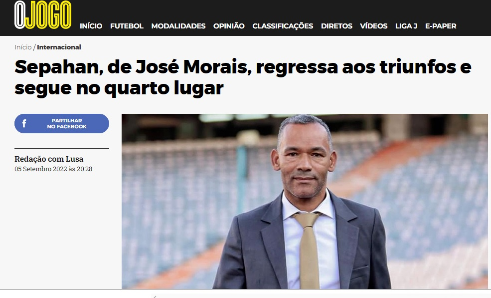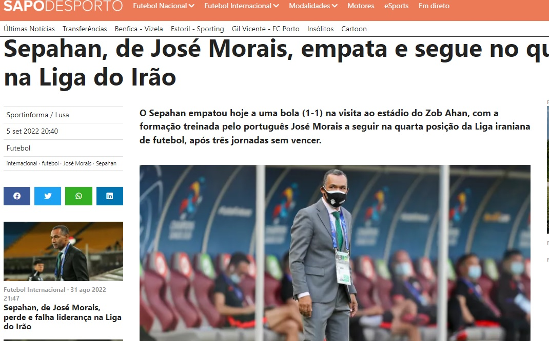 نشریه «desporto» پرتغال هم نوشت: مورایس همچنان از رسیدن به پیروزی در 3 بازی اخیر با سپاهان ناکام ماند و با گذشت 5 هفته از لیگ ایران با کسب 8 امتیاز در رده چهارم ماند.