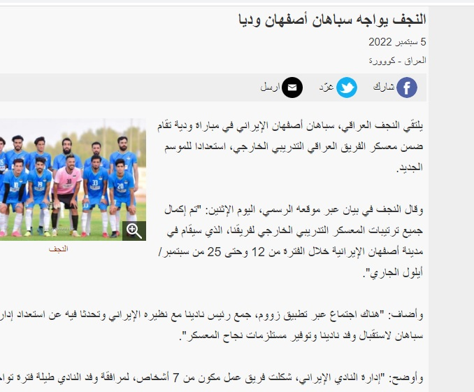 باشگاه نجف عراق خبر داد اردوی خارجی این تیم قرار است در ایران به میزبانی باشگاه سپاهان اصفهان برگزار شود.