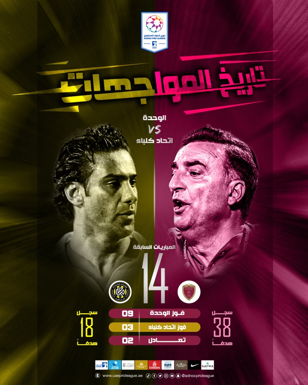 سازمان لیگ برتر فوتبال امارات در آستانه بازی اتحاد کلباء با الوحده در دومین هفته از لیگ پوستری از آمار تقابل این دو تیم منتشر کرد.
