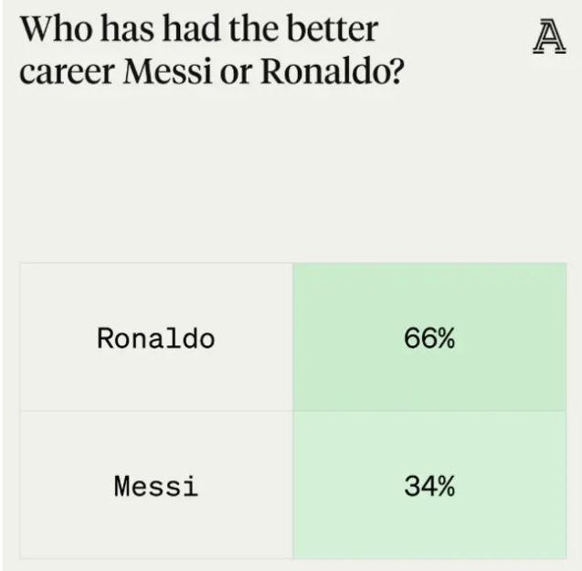 66 درصد بازیکنان سابق فوتبال وقتی از آنها سوال شد؛ مسی یا رونالدو، کدامیک دوران بهتری داشته اند؟ در پاسخ فوق ستاره پرتغالی را انتخاب کردند.