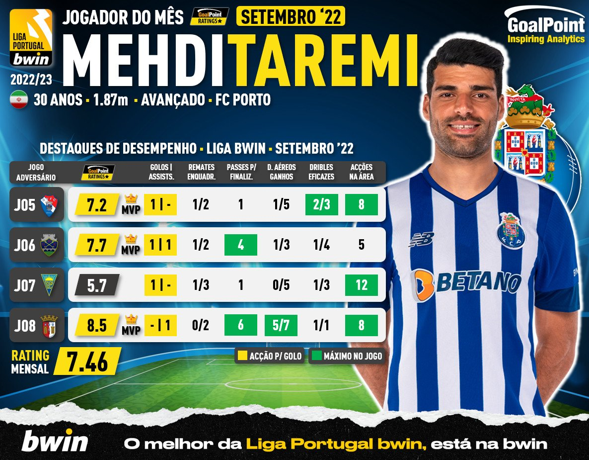 سایت «گل پوینت» پرتغال روز گذشته مهدی طارمی ستاره تیم ملی کشورمان و عضو باشگاه پورتو را به عنوان بهترین بازیکن ماه لیگ پرتغال انتخاب کرد.