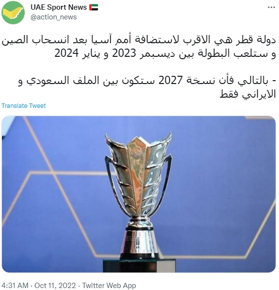 در همین رابطه سایت «اسپورت» امارات در تحلیلی نوشت: قطر نزدیکترین گزینه برای میزبانی از مسابقات جام ملتهای آسیا 2023 بعد از انصراف چین است. در نتیجه قطر از پرونده نامزدی برای میزبانی از جام ملتهای آسیا 2027 کنار میرود و رقابت برای میزبانی از این تورنمنت بزرگ میان ایران و عربستان بالا میگیرد.