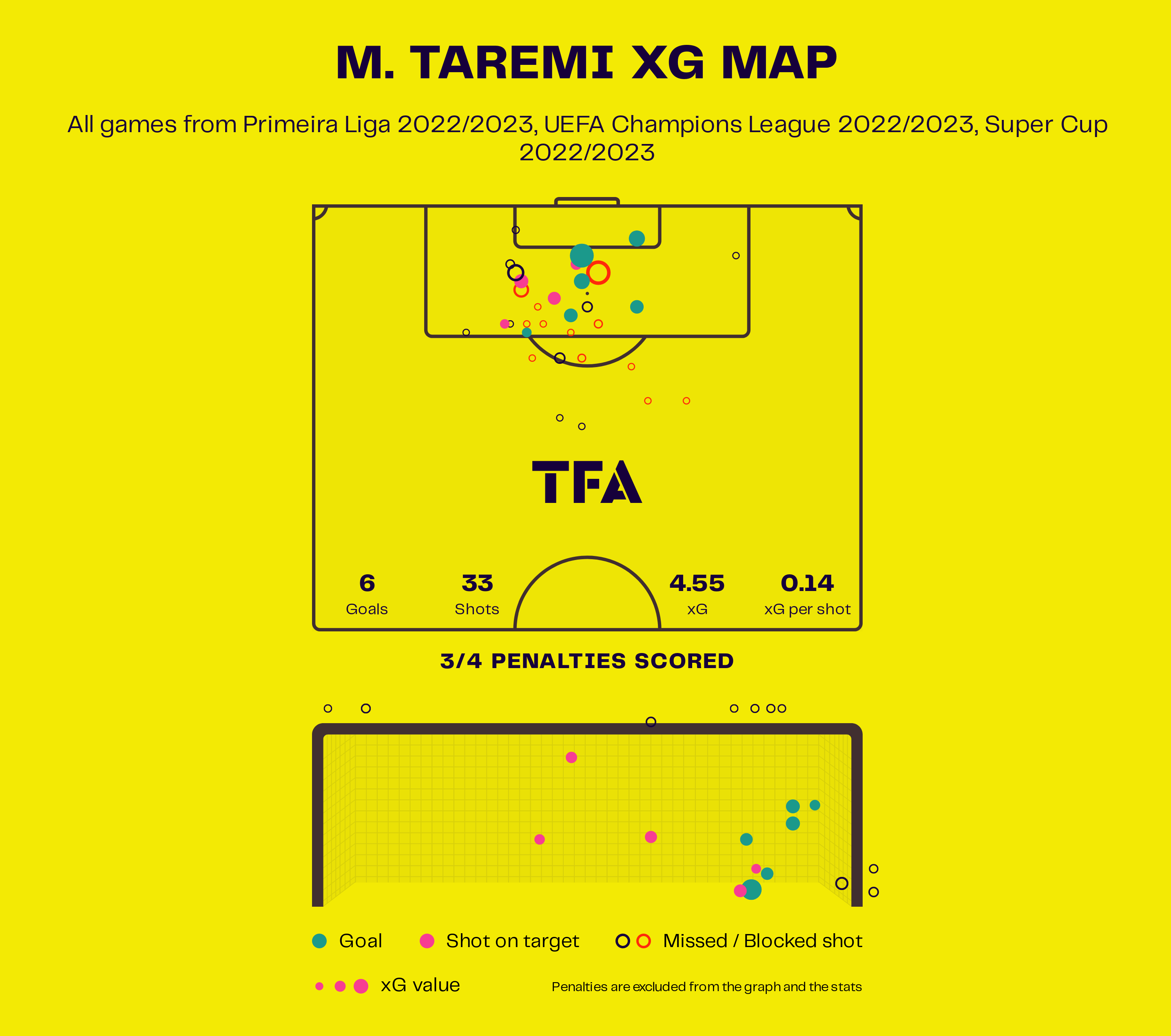 ملی پوش ایرانی از مجموع 33 شوت 6 گل غیر پنالتی در تمامی رقابت ها به ثمر رسانده است و نسبت به xG خود 4.56 عملکرد بهتری دارد.