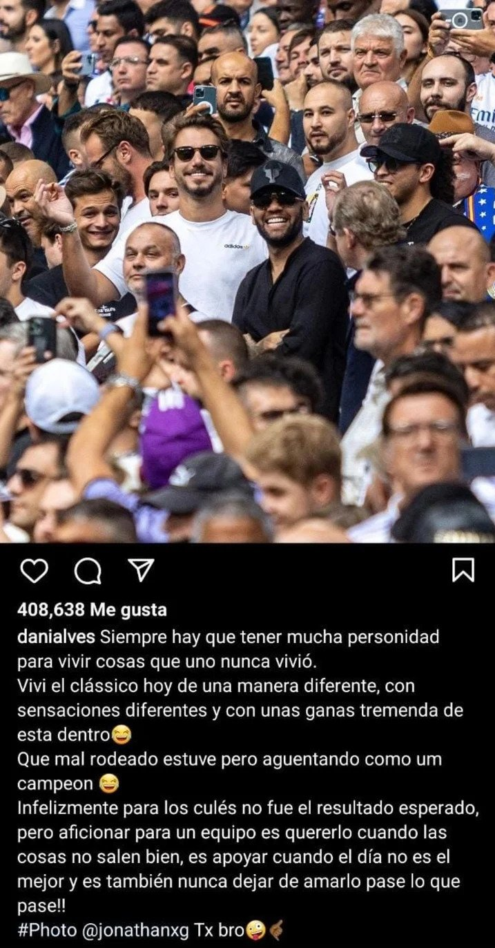 دنی آلوز در صفحه اینستاگرام خود به طنز نوشت که به عنوان نفوذی در میان هواداران رئال حاضر شده است. او نوشت: شما همیشه باید چیزهایی را تجربه کنید که در گذشته تجربه نکردید. من میان طرفداران رئال بودم ولی توانستم به مانند یک قهرمان رفتار کنم.متاسفانه این نتیجه، نتیجه دلخواه برای هواداران کاتالان نبود ولی شما وقتی عاشق یک تیم هستید، نتیجه بد باعث نمیشود علاقه و عشقتان نسبت به آن کم شود یا تغییری کند.