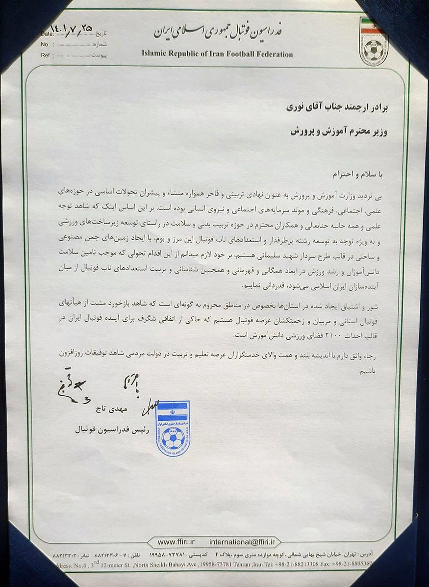 در آیین افتتاح چهلمین دوره مسابقات ورزشی مدارس کشور و افتتاح 1017 پروژه از 2100 فضای ورزشی دانش آموزی طرح شهید سلیمانی که در دبیرستانی در شهر تهران برگزار شد، این تقدیرنامه از سوی مهدی محمدنبی نایب رئیس و داوود پرهیزگار دبیرکل فدراسیون فوتبال به نیابت از رییس این فدراسیون به وزیر آموزش و پرورش اهداء شد.