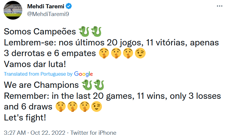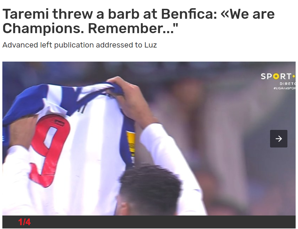 این اختلاف 8 امتیازی و دشمنی بنفیکا و پورتو باعث شد تا پست مهدی طارمی به شدت در فضای پرتغال دیده شود و اقدام ستاره ایران به عنوان یک نیش از سوی نشریه معتبر رکورد خوانده شود.