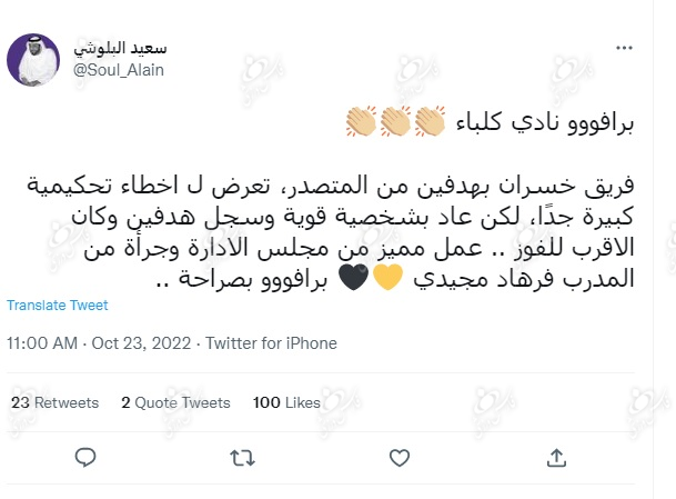سعید البلوشی خبرنگار اماراتی در این زمینه، گفت: آفرین به باشگاه اتحاد کلباء...  تیمی در حالیکه با دو گل مقابل صدرنشین لیگ شکست خورده بود و اشتباهات داوری زیادی علیه اش رخ داد ولی با شخصیت قوی به بازی برگشت و دو گل زد و در آستانه پیروزی بود.
